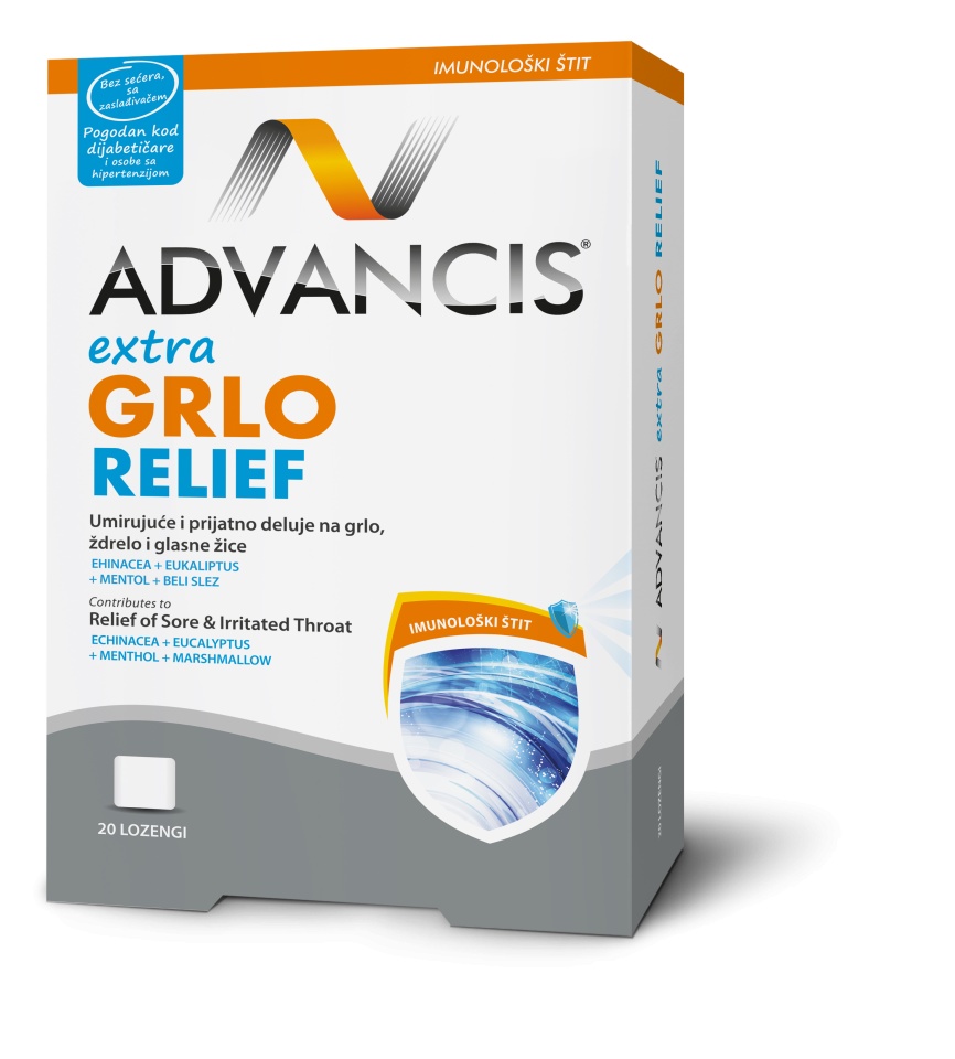 Advancis® Extra Throat Relief je prirodni dodatak za ublažavanje bolova u grlu sa biljnim ekstraktima ehinacee, eukaliptusa i belog sleza. Advancis® Extra Throat Relief je dodatak ishrani sa biljnim ekstraktima za ublažavanje simptoma upale grla i kašlja. Sadrži tri ključna ekstrakta – ehinaceu, eukaliptus i beli slez, koji imaju kombinovani efekat jačanja imunog sistema, antiseptičko i demulcentno dejstvo. Ovaj proizvod pruža trenutno olakšanje, osvežavajući efekat zahvaljujući mentolu i pomaže pri smanjenju kašlja i iritacije sluznice. Sastav i efekti: Ehinacea (Echinacea purpurea): Pomaže u jačanju imuniteta, smanjuje težinu i trajanje prehlade i gripa. Eukaliptus (Eucalyptus globulus): Antiseptik, ekspektorans, ima protivupalna svojstva. Beli slez (Althaea officinalis): Demulcent, antimikrobno i antivirusno dejstvo, smanjuje iritaciju sluznice. Mentol: Osvežavajući efekat i dekongestivno dejstvo. Preporučena upotreba: Proizvod se može koristiti do 6 puta dnevno, puštanjem pastile da se rastvori u ustima. Preporučuje se da se proizvod koristi kontinuirano do 8 nedelja, uz period odmora od 2 do 3 nedelje. Napomene: Proizvod je namenjen odraslima i deci starijoj od 12 godina. Pogodan je za dijabetičare i hipertenzivne pacijente, ali se ne preporučuje trudnicama i dojiljama bez prethodnog medicinskog saveta.