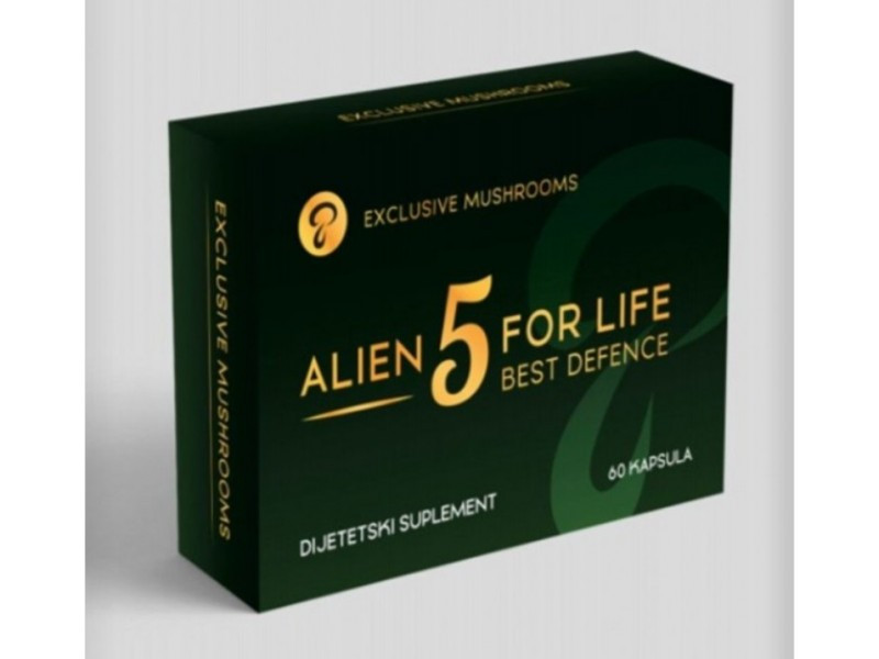 ALIEN 5 FOR LIFE je jedinstven proizvod na nasem trzistu i jedan od najmoćnijih preparata na bazi gljiva sa širokim spektrom dejstva,u kategoriji dodataka ishrani. Sastav kapsule: Reishi gljiva u prahu (Ganoderma Lucidum), Shii-Take gljiva(Lentinula Edodes) u prahu, gljiva Bukovača (Pleurotus Ostreatus) u prahu, gljiva Hericium Erinaceus u prahu, gljiva Cordyceps Militaris u prahu, Vitamin ‘C’ (L-askorbinska kiselina), kukuruzni skrob, kapsula-zelatin, boja-titan-dioksid, sredstvo protiv zgrudnjavanja-magnezijum-stearat. Proizvedeno u Republici Srbiji Napomena: Dodaci ishrani, nisu zamena za raznovrsnu i uravnoteženu ishranu i zdrav način života. Način upotrebe: 2-4 kapsule dnevno,sa dosta vode (min 2dl). Može se uzimati najviše 6 kapsula dnevno. Čuvati van domašaja dece! Način čuvanja: Čuvati u originalnom pakovanju, zaštićeno od svetlosti i vlage, na sobnoj temperaturi. Upozorenje: Proizvod se ne preporučuje deci, trudnicama i dojiljama. Osobe koje imaju neko dijagnostifikovano oboljenje ili koriste lekove,pre upotrebe preparata treba da se posavetuju sa lekarom ili farmaceutom. U slučaju preosetljivosti na bilo koji sastojak, potrebno je odmah prekinuti uzimanje i posavetovati se sa lekarom. Preporučena dnevna doza, se ne sme prekoračiti !