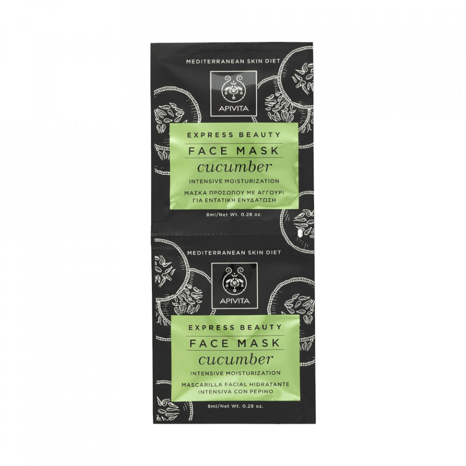 APIVITA EXPRESS BEAUTY MASKA ZA HIDRATACIJU KRASTAVAC Za intenzivnu hidrataciju kože. Dubinski hidrira i osvežava kožu zahvaljući ekstraktu krastavca, medu hijaluronskoj kiselini i esencijalnom ulju geranijuma. Koža je umirena, omekšana i podmlađena. Za sve tipove kože. Naneti deblji sloj maske na čistu kožu lica izbegavajući zonu oko oka. Ostaviti da deluje 10 minuta. Višak maske ukloniti tupferom, a zatim temeljno isprati. Koristiti 1-2 puta nedeljno.
