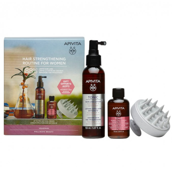 Apivita rutina za jačanje kose za žene sadrži Apivita losion tonik protiv opadanja kose, Apivita tonik šampon i masažer temena glave. APIVITA Losion protiv gubitka kose namenjen muškarcima i ženama. Klinički dokazano redukuje opadanje kose i povećava njenu gustinu*. Podstiče rast kose čineći vlas jačom i debljom pružajući kosi više volumena. Tonira i revitalizuje skalp dok istovremeno reguliše lučenje sebuma. *50 korisnika, 3 meseca. Dermatološki testirano. Svakodnevno naprskati na koren, na vlažnu ili suvu kosu (8-10 sprej doza na svaku polovinu vlasišta) I nežno umasirati. Ne ispirati. Koristiti minimum 3 meseca. Pakovanje: 150ml APIVITA HAIRLOSS TONIK ŠAMPON ZA ŽENE Efikasno deluje protiv sezonskog ili naslednog gubitka kose, pročišćava vlasište i promoviše rast zdrave kose. Kombinacija pasjeg trna, koji je bogat vitaminima B kompleksa, aminokiselina i masnih kiselina obezbeđuje volumen i sjaj. Naneti malu količinu na kožu glave i na kosu, a zatim nežno umasirati. Temeljno isprati. Koristiti najmanje 3 meseca. Pakovanje: 75ml U paketu se nalazi i masažer koji pomaže detoksikaciju i uklanja nečistoće podržavajući zdrav rast kose. Zemlja porekla: Grčka Uvoznik: Evropalek doo, Beograd