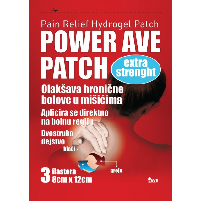 Opis proizvoda: Hidrogelni flaster sa dvostrukim dejstvom TOPLO i HLADNO. Toplotna terapija se preporučuje u cilju ublažavanja hroničnog bola u mišićima (u skladu sa orijentalnom medicinom). Power Ave Patch pomaže stimulaciji krvne cirkulacije i obezbeđuje ublažavanje hroničnog bola u mišićima ramena, vrata,donjeg dela leđa kao i drugih regija. Toplo-hladni efekti obezbeđuju višestruko bolje rezultate od samo jednog efekta samostalno. Sastav: L Mentol, Vanilllyl butyl ether, ulje mentola Pakovanje: 3 flastera 8 x 12 cm