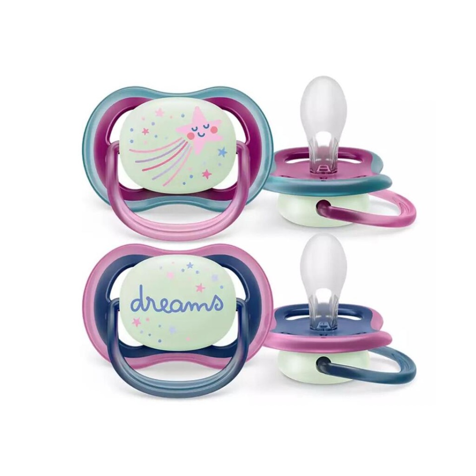 Avent Varalica 6-18M Ultra Air Nighttime Star/Dreams SCF376/14 Avent varalica za bebe uzrasta od 6 do 18 meseci noćna Ortodontska, sklopiva, sa zaštitnim poklopcem, od silikona bez BPA, bez mirisa i ukusa. Prati prirodan razvoj detetovog nepca, zuba i desni. U pakovanju se nalaze dve varalice sa zaštitnim poklopcima. Može se sterilisati • Može se prati u mašini za sudove