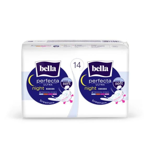 Bella Perfecta Blue Ultra Night higijenski ulošci 14 komada Ultra tanki dugački higijenski uložak – 2mm – će vam dati nevidljivu zaštitu I sigurnost tokom cele noći. Prekriven sa ultra-upijajućim mekanim slojem koji diše I sadrži mikrotunele koji brzo pretvaraju tečnosti u gel. Malo duži od standardnog, ultra tankog uloška sa povećanim moćima upijanja vam garantuje miran i bezbrižan dan. Specijalne barijere na ivicama uloška koje pružaju dodatnu sigurnost I bolju zaštitu od curenja. Pakovanje sadrži 14 komada.