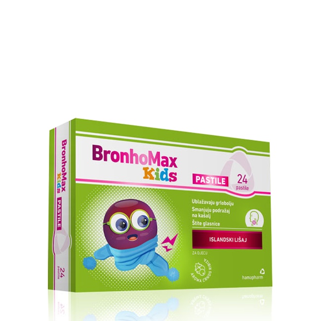 Bronhomax KIDS pastile s ekstraktom islandskog lišaja: • Smanjuju nadražaj na kašalj • Ublažavaju bol i suvoću grla • Štite glasne žice BronhoMax KIDS pastile za grlo sadrže ekstrakt islandskog lišaja. Smanjuje nadražaj na kašalj Ublažavaju grlobolju Ekstrakt islandskog lišaja sadrži polisaharide koji oblažu grlo, smanjuju nadražaj na kašalj delujući kao antitusik pa dodatno vlaže i oporavljaju nadraženu i oštećenu sluzokožu. BronhoMax KIDS pastile su meke pastile i ne sadrže šećer. Ugodnog su slatkog okusa s aromom crne ribizle. Deca starija od 4 godine: 1 pastilu otopiti polagano u ustima 6 puta dnevno, prema potrebi.