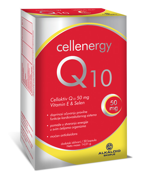 CELLENERGY Q10 50MG Dejstvo: Koenzim Q10, poznat kao ubidekarenon je supstanca slična vitaminima koja se sintetiše u jetri, ali se isto tako unosi u organizam preko hrane. Neophodan je za normalno funkcionisanje ćelija organizma. Koenzim Q10 je moćan antioksidans koji transformiše energiju iz hrane u energiju koju telo koristi za svoje metaboličke procese i mišićnu funkciju. Svim organima sa velikim energetskim potrebama neophodna je velika količina koenzima Q10. Visoka koncentracija koenzima Q10 u srčanom mišiću navodi na zaključak o važnoj ulozi koenzima Q10 za pravilnu funkciju srca. Ono što je najbitnije, niske vrednosti koenzima Q10 u srčanom mišiću mogu se popraviti pravilnom suplementacijom. Suplementacija koenzima Q10 se preporučuje i svim pacijentiama koji koriste statine. Kako je utvrđeno da statini (lekovi koji deluju na smanjenje stvaranja holesterola u organizmu) dovode do deficita koenzima u srčanom mišiću, počela je njegova rutinska primena uz terapiju statinima. Koristan je kod postinfarktnog stanja jer obezbeđuje bolje snabdevanje energijom preostalog dela zdravog srčanog mišića. Koenzim Q10 u proizvodu CellEnergy Q10 je dobijen prirodnim procesom fermentacije. Prirodni oblik koenzima Q10 je rastvorljiv u vodi i ima 3-4 puta veću resorpciju u telu u odnosu na oblik rastvorljiv u mastima. CellEnergy Q10 sadrži vitamin E i selen, koji doprinose zaštiti ćelija od oksidativnog stresa. Ekstrakt crnog bibera povećava resorpciju koenzima Q10. Sastav Jedna kapsula sadrži: 50 mg koenzima Q10 (ubidekarenon, dobijen prirodnom fermentacijom); 50 mg vitamina E ( u obliku D-alfa tokoferol acetata); 20 mg ekstrakta ploda crnog bibera sa 10-15% piperina; 80 µg selena Ostali sastojci: sredstvo za povećanje volumena: kukuruzni dekstrin, sredstvo protiv zgrušavanja: magnezijum-stearat biljnog porekla. CellEnergy Q₁₀ 50 mg kapsule se upotrebljavaju kao dodatak ishrani i savetuju se za zaštitu ćelija od oksidativnog oštećenja Vitamin C i selen doprinose zaštiti ćelija od oksidativnog stresa Pakovanje: Kartonska kutija sadrži 30 kapsula (3 blistera) i Uputstvo za upotrebu.