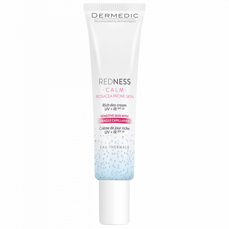 REDNESS bogata dnevna krema UV+IR SPF20 štiti kožu od pregrevanja usled izlaganja sunčevoj svetlosti i drugim izvorima zračenja. jača osetljivu kožu zahvaćenu kuperozom i štiti je od faktora koji izazivaju nastanak i konsolidaciju crvenila. Jača osetljivu kožu zahvaćenu kuperozom i štiti je od faktora koji izazivaju nastanak i konsolidaciju crvenila, proširenje površinskih kapilara i eritematozne reakcije. Inovativni ROSASHIELD kompleks obnavlja vitamine i elemente u tragovima. Phisavie® i kompleks UV + IR (SPF 20) štite kožu od pregrevanja usled izlaganja sunčevoj svetlosti i drugim izvorima zračenja. Hrani, jača i regeneriše kožu. Nekomedogena. Način upotreba: Ravnomerno naneti proizvod na lice, vrat i dekolte i ostaviti da se potpuno upije. Sastav: Termalna voda, Rosashield kompleks, Neutrazen™, Physavie®, UVA + UVB filteri, kokosovo ulje, alantoin, glicerin Pakovanje: 40ml Zemlja porekla: Poljska Uvoznik: IntusPharm doo, Novi Sad
