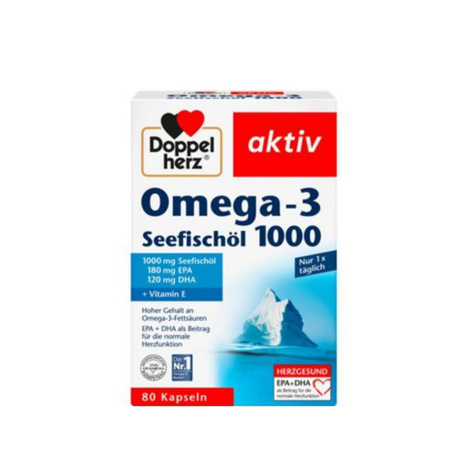 DOPPELHERZ AKTIV OMEGA 3 1000MG 80 KAPSULA 1000 mg ulja morskih riba u koncentrovanoj formi 300 mg Omega 3 masnih kiselina po kapsuli (180 mg EPA i 120 mg DHA), poboljšavaju funkciju mozga i oštrinu vida EPA i DHA regulišu nivo holesterola i triglicerida i normalizuju rad srca 12 mg vitamina E štiti ćelije od oksidacionog stresa Efekat anti-agregacije trombocita Stimuliše cirkulaciju krvI Bel glutena. Bez laktoze. Način primene: Jedna kapsula dnevno sa dosta tečnosti. Pakovanje: 80 gel kapsula Zemlja porekla: Nemačka