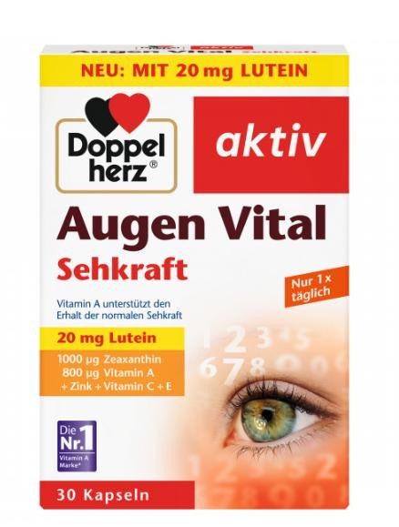 DOPPELHERZ AKTIV VITAMINI I MINERALI ZA OČI 30 KAPSULA Kompleks 15 mg Luteina i 1000 μ g Zeaksantina, obogaćen vitaminima A, C, E i cinkom. Vitamin A doprinosi normalnom održanju vida tokom dana i noći. Cink doprinosi normalnom vidu i pravilnom metabolizmu vitamina A, dok zajedno sa vitaminima C i E utiče na zaštitu ćelija od oksidacionog stresa. Bez glutena. Bez laktoze. Način primene: Jedna kapsula dnevno sa dosta tečnosti. Pakovanje: 30 kapsula Zemlja porekla: Nemačka