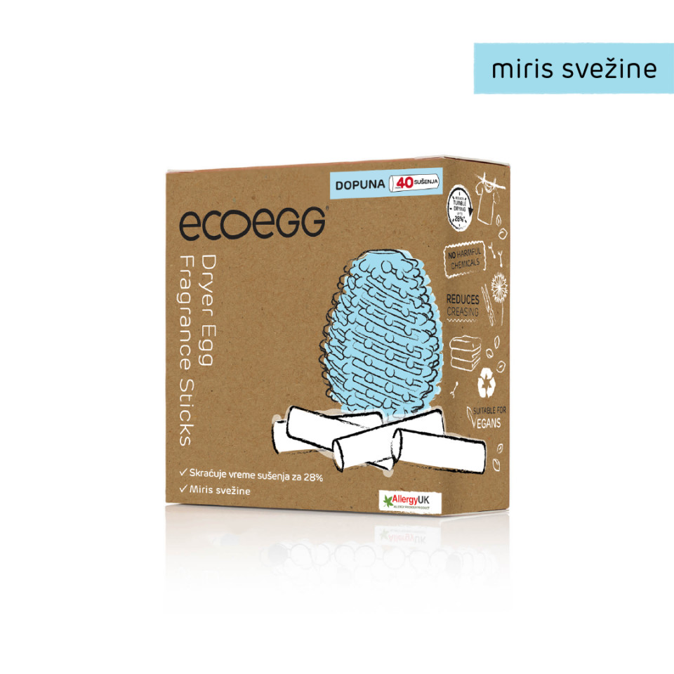 ECOEGG 3u1 DOPUNA ZA EKO-JAJA ZA SUŠILICU MIRIS SVEŽINE 40 SUŠENJA ECOEGG 3u1 dopune za eko-jaja za sušilicu su inovativni proizvodi iz Velike Britanije. Ovu dopunu od 40 sušenja, kupujete nakon potrošenog pakovanja vašeg ECOEGG 3u1 eko-jaja za sušilicu za 40 sušenja, dok vaše ECOEGG eko-jaje možete koristiti iznova i iznova, doprinoseći smanjenju plastičnog otpada! Ljubitelji prirodnih proizvoda obožavaju ECOEGG eko-jaja za sušilicu jer sadrže 0% toksičnih hemikalija a pritom su 100% hipoalergijski, veganski i ekološki! Dermatološki i klinički testirani, odobreni od ALLERGY UK ovi proizvodi za sušenje veša pogoduju i osobama sa osetljivom kožom. Način upotrebe: Ubaciti po jedan dopunski mirisni štapić u oba eko-jajeta, istovremeno izguravajući stare štapiće napolje. Potom, staviti oba eko-jajeta u bubanj sušilice zajedno sa vešom i uključiti željeni program. Eko-jaja za sušilicu će skratiti vreme sušenja i do 28% , daće vešu dodatni miris- proleća, smanjiće gužvanje i omekšaće ga. Pogodno za sve vrste tkanina, sem za veoma osetljivu tkaninu. Ovaj proizvod je idealan u kombinaciji sa ECOEGG 2u1 eko-deterdžentom za veš.