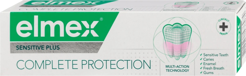 Elmex Complete Protection Sensitive Plus Pasta za zube 75ml Za jake zube i zdrave desni. Štiti od osetljivih zuba i desni. Štiti od zubnog karijesa i iritacija desni. Elmex Sensitive Plus pasta za zube pruža potpunu zaštitu i brine se za osetljive zube i desni. Sadrži klinički dokazanu tehnologiju, koja pruža zaštitu pomažući da se održavaju snažni zubi, zdrave desni dok štite osetljive zube. Sa dnevnom upotrebom Elmex Sensitive Plus paste za zube, pomažete Vašim zubima u zaštiti od zubnog karijesa, iritacija desni i od nakupljanja kamenca. Takođe, pomaže u vraćanju prirodne beline zuba. Način upotrebe: Malu količinu paste naneti na četkicu za zube. Koristiti svakodnevno. Sastav: Aqua, Sorbitol, Hydrated Silica, Glycerin, Sodium Methyl Cocoyl Taurate, Tetrasodium Pyrophosphate, Aroma, Zinc Phosphate, Sodium Citrate, Microcrystalline Cellulose, Cellulose Gum, Cocamidopropyl Betaine, Stannous Fluoride, Sodium Saccharin, Xanthan Gum, Citric Acid, Sodium Fluoride, Sucralose, Benzyl Alcohol. Sadrži: Stannous Fluoride i Sodium Fluoride Ukupan sadržaj Fluorida: 1450 ppm. Pakovanje: 75ml