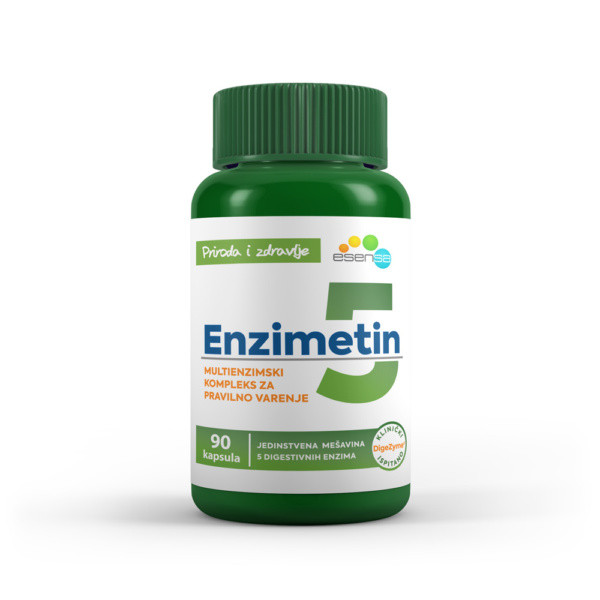 ENZIMETIN 5 kapsule sadrže DigeZyme®, klinički ispitan multienzimski kompleks 5 digestivnih enzima namenjen poboljšanju varenja i apsorpcije hranljivih materija: Amilaza + Proteaza + Celulaza + Laktaza + Lipaza Namenjen je smanjenju simptoma nepravilnog varenja kao što su bol u stomaku, nadutost, prisustvo gasova, podrigivanje, gorušica, dijareja i mučnina. ✔ ne sadrži enzime životinjskog porekla ✔ otporan na dejstvo želudačne kiseline ✔ poboljšava varenje i apsorpciju hranljivih materija iz hrane SASTAV: Mešavina digestivnih enzima (DigeZyme®) alfa-amilaza: 24000 DU/g Proteaza: 6000 PC/g Celulaza: 1100 CU/g Laktaza: 4000 ALU/g Lipaza: 200 FIP/g DELOVANJE: Digestivni enzimi su biokatalizatori procesa varenja u organizmu i imaju ključnu ulogu u razlaganju makronutrijenata, čime pomažu da organizam pravilno apsorbuje hranljive materije. Nepravilno varenje, uzrokovano nedostatkom ili neadekvatnom aktivnošću jednog ili više digestivnih enzima, može dovesti do malapsorpcije i niza povezanih zdravstvenih problema Suplementacija digestivnim enzimima sadržanim u ENZIMETIN 5® kapsulama pomaže smanjenje simptoma nepravilnog varenja kao što su: bol u stomaku, nadutost, prisustvo gasova, podrigivanje, gorušica, dijareja i mučnina. ENZIMETIN 5® kapsule se preporučuju kod: Problema sa varenjem i malapsorpcije Poremećaja egzokrine funkcije pankreasa Intolerancije na određene sastojke hrane (npr. laktozu) Bola ili osećaja težine u stomaku nakon obroka Nadutosti, flatulencije, podrigivanja i mučnine Grčeva i poremećaja pražnjenja creva Prekomernog ili brzog unosa hrane Neregulisane telesne težine Način upotrebe: Odrasli i deca starija od 12 godina: Tri puta dnevno uzimati 1 – 2 kapsule, u zavisnosti od potreba i preporuke lekara. Kapsule uzimati u toku ili neposredno posle obroka