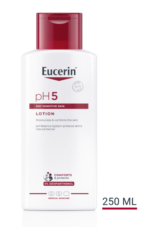 Aktivira zaštitu same kože zahvaljujući pH5 enzimskoj zaštiti Suvu, osetljivu kožu lako iziritiraju spoljašnji okidači kao što su često pranje, promene u temperaturi i izloženost agensima, što je sve čini još osetljivijom. Potrebno je više od blagog preparata za hidrataciju kako bi postala manje osetljiva. Eucerin pH5 Losion je blag, ali efikasan preparat za hidrataciju tela koji je posebno formulisan da učini suvu, osetljivu kožu tela otpornijom i manje osetljivom. Jedinstveni Eucerin pH Sistem ravnoteže sadrži pH5 Citratni pufer kako bi se obnovila i održala optimalna pH vrednost kože. Losion za telo sadrži, takođe, i dekspantenol, aktivni sastojak poznat po svojim regenerativnim svojstvima. Koristite ga svakodnevno za dugotrajnu zaštitu i kako bi vam koža bila meka i glatka. Eucerin pH5 Losion je pogodan je za upotrebu kod dece uzrasta od tri godine i starije. Način upotrebe: Nežno nanesite ujutru i uveče na temeljno očišćenu kožu tela. Sastav: Voda, Glycerin, Panthenol, C15-19 Alkane, Cetyl Palmitate, Caprylic-Capric-Triglyceride, Cetyl Alcohol, Hydrogenated Coco-Glycerides, Polybutene, Glyceryl Stearate SE, Citric Acid, Sodium Citrate, Tocopheryl Acetate, Sorbitan Stearate, Sodium Cetearyl Sulfate, Stearyl Alcohol, Dimethicone, Carbomer, Sodium Hydroxide, Tapioca Starch, Trisodium EDTA, Pentylene Glycol, Caprylyl Glycol, Phenoxyethanol, Benzyl Alcohol, BHT, Parfum. Pakovanje: 250ml Zemlja porekla: Nemačka Uvoznik: Beiersdorf