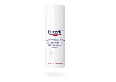 Eucerin je razvio dve linije preparata za preosetljivu kožu – UltraSENSITIVE i AntiREDNESS – gde svaki proizvod deluje na tri znaka i simptoma koja su svojstvena za ovo stanje: narušena barijerna funkcija kože, pojačana reaktivnost senzitivnih vlakana i crvenilo kože, koje je često izazvano zapaljenjem. Eucerin UltraSENSITIVE dnevna krema za suvu kožu preporučuje se za preosetljivu kožu kada je osnovni simptom neprijatan osećaj u koži praćen peckanjem, vrelinom i svrabom ali bez vidljivih znakova crvenila. Naneta nakon čišćenja, trenutno umiruje i ublažava suvu preosetljivu kožu lica, vrata i predela dekoltea pružajući joj dugotrajnu negu i zaštitu dok posebni voskovi u sastavu krema daju koži osećaj ishranjenosti i vlažnosti. Pošto preosetljivu kožu karakteriše narušena barijerna funkcija to uzrokuje da senzitivna vlakna u koži reaguju brže i jače na stresogene faktore. Ova iritacija dovodi do neprijatnih osećaja u koži i crvenila tipičnog za preosetljivu kožu. Ova bogata formula za negu i ublažavanje simptoma sadrži SymSitive *, prvi aktivni dermatološko-kozmetički sastojak koji ciljano deluje na uzročnik pojačane reaktivnosti kože. SymSitive* deluje efikasno kao regulator osetljivosti, snižavajući aktivaciju senzitivnih vlakana u epidermu. Eucerin UltraSENSITIVE dnevna krema za suvu kožu ne samo da trenutno ublažava simptome preosetljive suve kože, već tokom vremena pomaže u zaštiti barijerne funkcije kože i podiže prag podnošljivosti kože. Kao i svi drugi proizvodi Eucerin linije za negu preosetljive kože, i Eucerin UltraSENSITIVE dnevna krema za suvu kožu se nalazi u pakovanju koje sprečava zagađenje. Ona takođe sadrži samo ograničen borj sastojaka radi veće prečišćenosti i smanjenja rizika za nastanak reakcija. Eucerin UltraSENSITIVE dnevna krema za suvu kožu je „prečišćena” formulacija, što znači da sadrži samo ograničen broj sastojaka i da je bez konzervansa (uključujući parabene), parafina, mirisa i alkohola, boja i emulgatora.