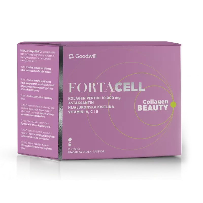 Fortacell Collagen Beauty, prašak za oralni rastvor , dodatak ishrani sa zaslađivačima. Sadrži čak 10 g hidrolizovanih kolagen peptida u 1 dozi, u moćnoj kombinaciji sa astaksantinom, hijaluronskom kiselinom i vitaminima A, C i E, koji pomaže tako što: -Sprečava opuštanje kože i ublažava bore -Poboljšava hidrataciju i elastičnost kože -Štiti kožu od štetnog sunčevog zračenja -Jača nokte, kosu, hrskavicu kostiju i zglobove -Podržava vezivno tkivo i pomaže kod bolova u zglobovima *Prijatan ukus borovnice