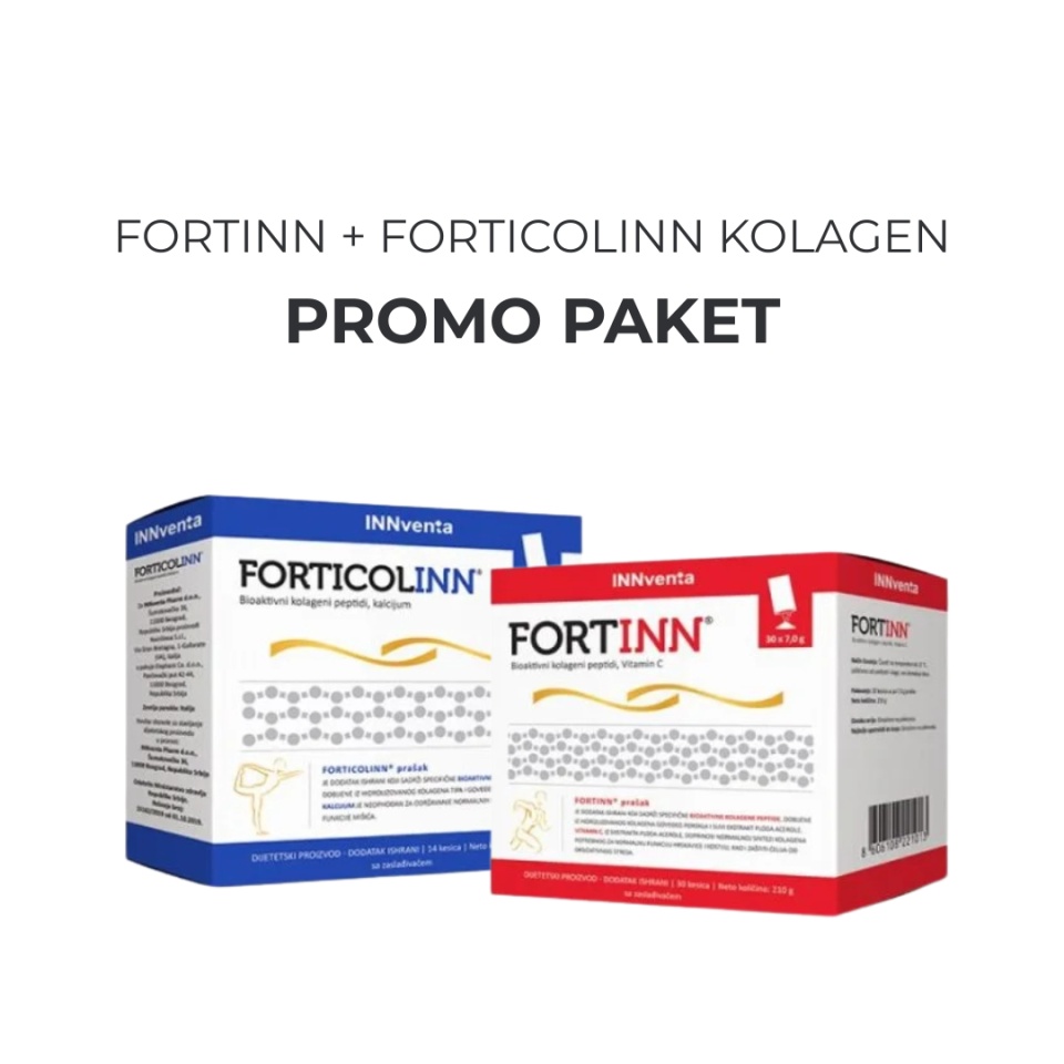 Promo pakovanje Fortinn 30 kesica + Forticolinn 14 kesica FORTICOLINN sadrži specifične bioaktivne kolagene peptide i kalcijum laktat optimizovan za lečenje osteopenije i osteoporoze. Peptidi su nastali iz posebnog, visoko kontrolisanog procesa hidrolize kolagena tipa I. https://www.apoteka-online.rs/kupi/forticolinn-kolagen-14-kesica-1708 Fortinn kolagen prašak FORTINN® Prvi pravi regenerator zglobne hrskavice FORTINN® je prvi preparat u Srbiji koji u svom sastavu sadrži specifične bioaktivne kolagene peptide. Kolageni peptidi se koriste u https://www.apoteka-online.rs/kupi/fortinn-kolagen-prasak-1062 savremenoj terapiji osteoartritisa i dovode do osetnog poboljšanja zdravlja zglobova. Šta je kolagen i čemu služi u našem organizmu? Kolagen je specifični protein koji je najzastupljeniji u organizmu i čini 30-35% ukupnih proteina . Do sada je poznato oko 25 različitih vrsta kolagena, od kojih su najvažnije četiri. Kolagen tip I se najviše nalazi u kostima, kolagen tip II u hrskavici, tip III uglavnom u šupljim organim, a kolagen tip IV u bazalnim membranama. Ljudski organizam ima sposobnost sinteze kolagena koji je neophodan za rast i obnavljanje tkiva. Međutim, s vremenom organizam postepeno gubi kapacitet njegove obnove zbog procesa starenja, trajnih preopterećenja (vrhunski sport, fizička aktivnost). U mladosti se gubitak kolagena brže nadoknađuje, ali s godinama taj gubitak postaje sve izraženiji, pa se računa da nakon 25. godine telo gubi u proseku 1,5% kolagena godišnje, a taj gubitak se nakon 40. godine drastično povećava. Može li se gubitak kolagena nadoknaditi? Način života, pravilna ishrana I kontinuirana fizička aktivnost mogu donekle ublažiti i usporiti gubitak kolagena i njegove posledice. Međutim u današnje vreme to nije dovoljno, zbog čega su nam nephodni dodaci ishrani s kolagenom koji usporavaju prirodni gubitak kolagena. Hidrolizovani kolagen tip II koji ima poboljšanu apsorpciju predstavlja jedinstveni molekul sa povoljnim uticajem na održavanje homeostaze zglobne hrskavice i izgradnje vezivnog tkiva. Kolagen tip II sadrži visok nivo hidroksiprolina i hidroksilizina, amino-kiselina koje su ključne za izgradnju vezivnog tkiva zglobne hrskavice. Kolagen tip II je najzastupljenija vrsta kolagena u zglobnoj hrskavici (85-90%) i zbog toga se njegova redovna oralna primena posebno savetuje kod osteoartritisa. Oralna administracija kolagena (samo određene dužine I molekulske težine) dovodi do njegove apsorpcije u tankom crevu i ugradnje u hrskavicu. Upotreba hidrolizovanog kolagena stimuliše statistički značajno povećanje sinteze hrskavičavog tkiva. FORTINN® značajno stimuliše regeneraciju zglobne hrskavice. Osim hirurškog lečenja terapija osteoartritisa je jako limitirana. Cilj je najčešće da se postigne olakšanje sistemskih simptoma i inflamacije. Svakako, potpuno je jednako važno tretirati pravi razlog oboljenja sa ciljem sprečavanja progresivne degeneracije hrskavice. FORTINN® sadrži specifične bioaktivne kolagene peptide koji se dobijaju posebnim enzimskim procesom iz hidrolizovanog kolagena tip II goveđeg porekla i jedini su koji naučno dokazano pospešuju sintezu nove hrskavice. Bioaktivni kolageni peptidi, jedini koji mogu da stimulišu hondrocite su oni koji imaju striktno određenu dužinu i molekulsku težinu oko 3,3 KDa što im omogućava apsorpciju u digestivnom traktu i dalju distribuciju kroz krvotok. FORTINN® preparat je namenjen za regeneraciju hrskavice,ima precizno određen i naučno potvđen sastav. Za razliku od običnog hidrolizovanog kolagena tip II koji samo daje gradivni elemenat, FORTINN®vrši direktnu stimulaciju hondrocita i dovodi do regeneracije hrskavice. FORTINN® je prvi hondroprotektor koji ima dokazano stimulativno dejstvo na hondrocite. Kako koristimo FORTINN®? Jedna kesica dnevno razmućena u čaši vode ili soka. Koliko dugo je potrebno koristiti FORTINN®? Studije pokazuju da suplementaciju treba održavati najkraće 3 meseca u kontinuitetu za primetno poboljšanje stanja, kontinuiranom upotrebom se postižu najbolji terapijski rezultati. Dužina terapije je individualna i zavisi od stepena degenerativnih promena na zglobnoj hrskavici.