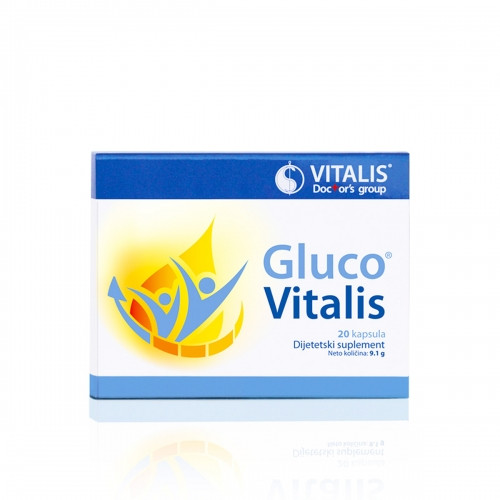 GLUCO VITALIS 20 KAPSULA Gluco Vitalis je namenjen kao dodatak ishrani za očuvanje normalnog nivoa glukoze u krvi. Gluco Vitalis je prirodni preparat na bazi alfalipoinske kiseline, ekstrakata cimeta, gimneme i gorke tikve, vitamina B1 i B6, hroma i cinka. • Cimet i hrom doprinose održavanju normalnog nivoa glukoze u krvi. • Cink doprinosi normalnom metabolizmu ugljenih hidrata i zaštiti ćelija od oksidativnog stresa. • Vitamin B1 i B6 doprinose normalnom energetskom metabolizmu, kao i normalnom funkcionisanju nervnog sistema. • Vitamin B6 doprinosi normalnom metabolizmu proteina i glikogena. Način upotrebe: Odrasli – popiti dva puta dnevno po jednu kapsulu pre obroka. Pakovanje: 20 kapsula Zemlja porekla: Srbija