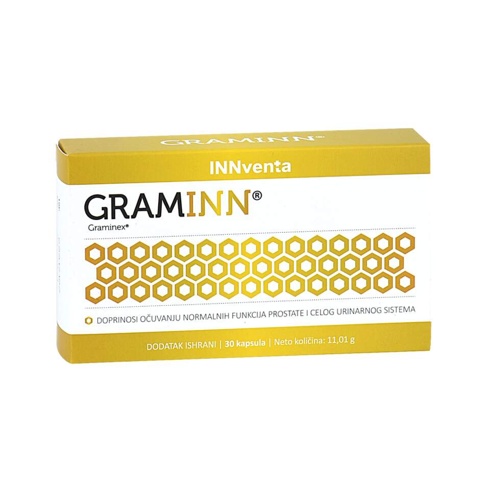 Graminn je dodatak ishrani, jedinstvenog sastava na bazi polenovog praha raži. Zahvaljujući svom protivupalnom i antimikrobnom efektu primenjuje se u lečenju upale prostate. Smanjuje učestalost noćnog mokrenja, dovodi do potpunijeg pražnjenja mokraćne bešike i do smanjnja bolova pri mokrenju. Povoljno deluje kod dobroćudnog uvećanja prostate i kod erektilnih problema.Doziranje i način primeneUzima se jedna kapsula dnevno sa čašom vode nakon jela. Prvi znaci pobojšanja se javljaju nakon mesec dana upotrebe, a preporuka je da se koristi tri meseca bez prekida.SastavPreparat je na bazi standardizovanog čistog ekstrakta polenovog praha raži (Rye pollen, Secale cerale). Zahvaljujući tehnologiji izrade alergeni iz omotača raži su odstranjeni iz preparata. Kapsule sadrže: 120 mg Graminex G60 cvetnog ekstrakt polena i 60 mg Graminex GFX ekstrakt polena.