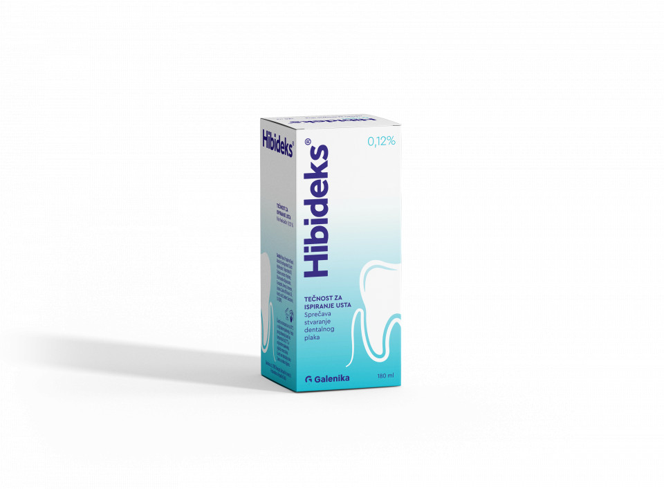 Antiseptični rastvor za ispiranje usta koji se koristi za sprečavanje stvaranja dentalnog plaka. Hibideks 0,12% tečnost za ispiranje usta se koristi: – za sprečavanje stvaranja dentalnog plaka; – kao dopuna mehaničkom odstranjivanju zubnih naslaga; – za zaštitu desni; – kao pomoćno sredstvo u održavanju oralne higijene, posebno u situacijama kada pranje zuba ne može biti adekvatno sprovedeno (npr. kod ortodontskih i protetskih tretmana); Sastojci: Aqua, Propylene Glycol, Alcohol, Hydrogenated Starch Hydrolysate, Polysorbate 80, Sodium acetate trihydrate, Chlorhexidine Digluconate, Eucalyptol, Aroma, Limonene, Linalool, Salvia Officinalis Oli, Acetic acid, Sodium Saccharin, CI 42090. Način primene Hibideks® 0,12% tečnost za ispiranje usta je namenjen za oromukozalnu upotrebu. Tečnost se ne sme gutati. Temeljno isprati usnu duplju sa 15 mL rastvora u trajanju od jedan minut, dva puta dnevno. Ispljunuti nakon primene. Posle primene Hibideks® 0,12% tečnosti za ispiranje usta nemojte ispirati usta vodom ili drugim rastvorima, nemojte jesti niti prati zube u periodu od 30 minuta. Ako se spremate za operaciju zuba, treba da isperete usnu duplju onako kako Vam je savetovao Vaš stomatolog. Treba da upotrebljavate tečnost onoliko dugo koliko Vam je rekao stomatolog ili lekar. Upotreba Hibideks® 0,12% tečnosti za ispiranje usta se preporučuje svima koji imaju iritirane desni, u trajanju od mesec dana. Pomaže pri održavanju higijene usne duplje osobama sa protezama ili drugim zubnim nadoknadama. Kod dopunskog održavanja higijene pacijenta sa zubnim protezama, protezu treba očistiti i potopiti u tečnost u trajanju od 15 minuta dva puta dnevno. Treba voditi računa da proizvod ne dođe u kontakt sa očima i ušima. U slučaju da proizvod dospe u oči, potrebno je oči odmah dobro isprati vodom. Hibideks® 0,12% tečnost za ispiranje usta je inkompatibilan sa anjonskim jedinjenjima koja se obično nalaze u pastama za zube. Zato treba koristiti pastu pre rastvora za ispiranje (ispiranje usta između aplikacija) ili u neko drugo doba dana. Pakovanje: 180ml