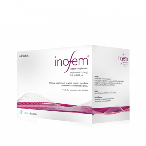Inofem je dijetetski suplement koji sadrži mio-inozitol (2000 mg) i folnu kiselinu (200μg). Proizvod je zasnovan na poslednjim dostignućima tehnologije čime je garantovan njegov najviši kvalitet. Zahvaljujući prisustvu kombinacije 2000 mg inozitola i 200 uq folne kiseline, Inofem pomaže održavanju hormonske ravnoteže žene i nadoknađuje svaki manjak tih supstanci u njenom telu. Hranljive materije koje se takođe nalaze u suplementu doprinose normalnom rastu materinskih tkiva tokom trudnoće (uključujući rane faze trudnoće) i posebno doprinose ćelijskoj deobi i hematopoezi. Aktivne supstance: Mio-inozitol je važan element ćelijskog zida i bihemijskih posrednika u našem telu. Mio-inozitol utiče na reakciju ćelije na insulin (hormon koji učestvuje u metabolizmu ugljenih hidrata). Uz to, naučne studije koje su izvedene u poslednje dve decenije su pokazale značaj uloge koju mio-inozitol ima u procesu zrenja oocita u jajnicima. Folna kiselina pripada grupi B vitamina i ima uticaja ne brojne metaboličke funkcije u organizmu. Folna kiselina omogućava održavanje normalnog metabolizma homocisteina i sinteze aminokiselina. Takođe učestvuje u ćelijskoj deobi (uključujući deobu oocita) i podržava normalnu hematopoezu. Pomoćne materije: Maltodekstrin je prirodna supstanca biljnog porekla i predstavlja mešavinu polisaharida i oligosaharida. U sklopu Inofem®, maltodekstrin predstavlja nosač mešavine aroma i vitamina, i pogodan je za precizno doziranje folne kiseline. Količina maltodekstrina koja se nalazi u jednoj vrećici Inofem® nije veća od 0.037g (37 mg) i nije kontraindikovana čak ni za pacijente sa dijabetesom. Aroma limuna Ko treba da koristi Inofem? Zbog svog sastava, Inofem je namenjen prvenstveno ženama sa policističnim ovarijalnim sindromom (PCOS), ženama sa poremećajima menstrualnog ciklusa i dijabetesom tipa 2. Upotreba: Jednom ili dva puta dnevno 1 kesica praška rastvorena u čaši vode.