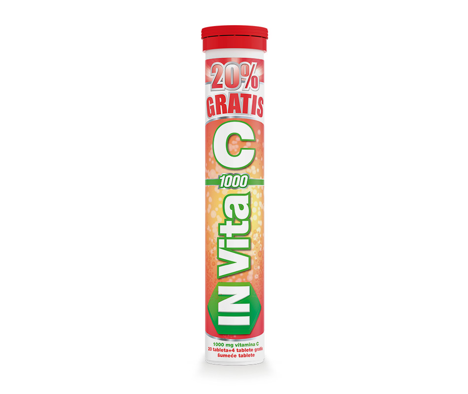 INVITA VITAMIN C 1000MG ŠUMEĆE TABLETE IN Vita C je dodatak ishrani neophodan za očuvanje vitalnosti i poboljšanje otpornosti organizma. IN Vita C nadoknađuje dnevne potrebe za vitaminom C. Vitamin C ima važnu ulogu u jačanju imunog sistema. Kao antioksidans vitamin C neutrališe slobodne radikale u ćeliji i doprinosi normalnom funkcionisanju imunog i nervnog sistema. Naročito se preporučuje u periodima prehlada i virusnih infekcija, kod povišene telesne temperature, povećanih potreba usled intenzivnog rasta i razvoja, povećane fizičke aktivnosti, u trudnoći i kod pušača. Aroma: pomorandža i breskva Način upotrebe: Jednu šumeću tabletu dnevno rastvoriti u čaši (200ml) hladne vode Pakovanje: sadrži 20 + 4 gratis šumeće tablete Zemlja porekla: Srbija