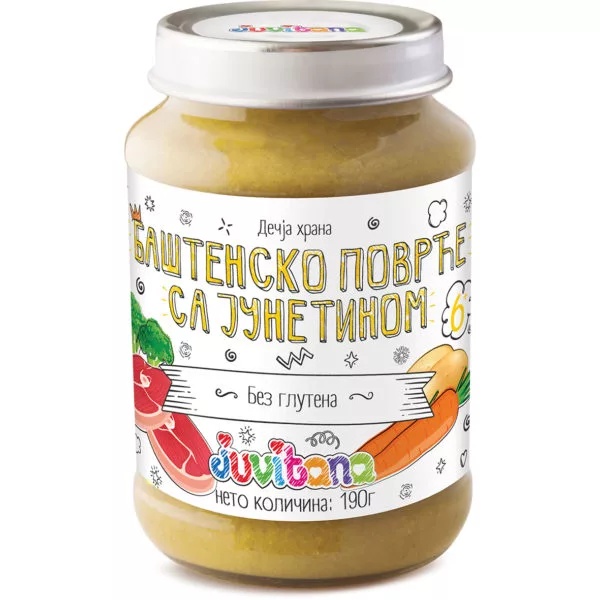 Juvitana kašica od baštenskog povrća sa junetinom 190g 6+ Ukus kašice: baštensko povrće sa junetinom Od 6. meseca starosti. Proizvedeno od kvalitetnih sirovina. Bez glutena. Juvitana dečija kašica od baštenskog povrća sa junetinom 190g namenjena je bebama uzrasta od 6. meseca. Ova kašica je fine homogene strukture, lako svarljiva, ukusna, energetski pogodna kao prva nemlečna hrana odojčeta. Odličan je izvor vitamina, minerala, antocijana i dijetnih vlakana. Juvitana kašica od baštenskog povrća sa junetinom je prirodna i zdrava hrana bez dodatka konzervansa, arome i veštačkih boja. Ne sadrži gluten. Konstantan kvalitet, sigurnost, zdravstvena bezbednost i jednostavnost pripreme samo su deo prednosti ove kašice. Proizvodi se od kvalitetne sirovine strogo kontrolisanog porekla, potpuno prirodnih i zdravih plodova ubranih u fazi tehnološke zrelosti, kako bi se sačuvale sve hranljive i zaštitne materije. Sastav: Šargrepa 15%, brokoli 15%, juneće meso 12%, krompir 10%, voda, pirinčano brašno, kuhinjska so Proizvođač: SWISSLION TAKOVO DOO Narodnog heroja Radovana Grkovića 20, Gornji Milanovac