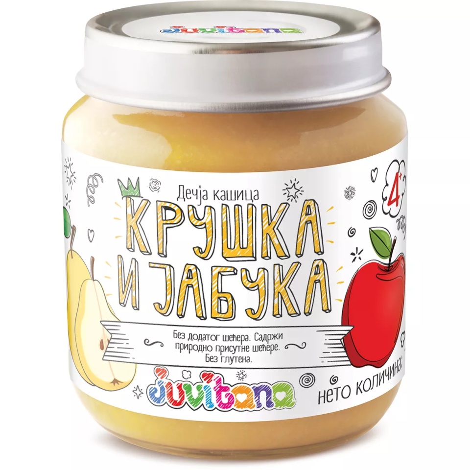 Juvitana kašica od kruške i jabuke 128g 4+ Ukus kašice: kruška i jabuka Od 4. meseca starosti. Proizvedeno od kvalitetnih sirovina. Bez glutena. Juvitana dečija kašica od kruške i jabuke 128g namenjena je bebama uzrasta od 4. meseca. Ova kašica je fine homogene strukture, lako svarljiva, ukusna, energetski pogodna kao prva nemlečna hrana odojčeta. Odličan je izvor vitamina, minerala, antocijana i dijetnih vlakana. Juvitana kašica od kruške i jabuke je prirodna i zdrava hrana bez dodatka konzervansa, arome i veštačkih boja. Ne sadrži gluten. Konstantan kvalitet, sigurnost, zdravstvena bezbednost i jednostavnost pripreme samo su deo prednosti ove kašice. Proizvodi se od kvalitetne sirovine strogo kontrolisanog porekla, potpuno prirodnih i zdravih plodova ubranih u fazi tehnološke zrelosti, kako bi se sačuvale sve hranljive i zaštitne materije. Sastav: Kruška 70%, sok od koncemtrisanog voćnog soka jabuke 25%, pirinač, Vitamin C Proizvođač: SWISSLION TAKOVO DOO Narodnog heroja Radovana Grkovića 20, Gornji Milanovac