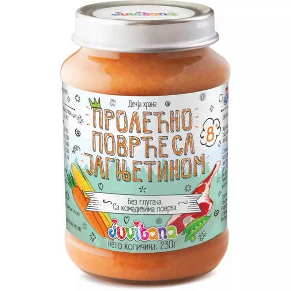 Juvitana kašica prolećno povrće sa jagnjetinom 230g 8+ Ukus kašice: prolećno povrće sa jagnjetinom Od 8. meseca starosti. Proizvedeno od kvalitetnih sirovina. Bez glutena. Juvitana dečija kašica od prolećnog povrća sa jagnjetinom 230g namenjena je bebama uzrasta od 8. meseca. Ova kašica je fine homogene strukture, lako svarljiva, ukusna, energetski pogodna kao prva nemlečna hrana odojčeta. Odličan je izvor vitamina, minerala, antocijana i dijetnih vlakana. Juvitana kašica od prolećnog povrća i jagnjetinom je prirodna i zdrava hrana bez dodatka konzervansa, arome i veštačkih boja. Ne sadrži gluten. Konstantan kvalitet, sigurnost, zdravstvena bezbednost i jednostavnost pripreme samo su deo prednosti ove kašice. Proizvodi se od kvalitetne sirovine strogo kontrolisanog porekla, potpuno prirodnih i zdravih plodova ubranih u fazi tehnološke zrelosti, kako bi se sačuvale sve hranljive i zaštitne materije. Sastav: Šargrepa 30%, kukuruz 10%, grašak 10%, jagnjeće meso 10%, voda, pirinčano brašno, so Proizvođač: SWISSLION TAKOVO DOO Narodnog heroja Radovana Grkovića 20, Gornji Milanovac