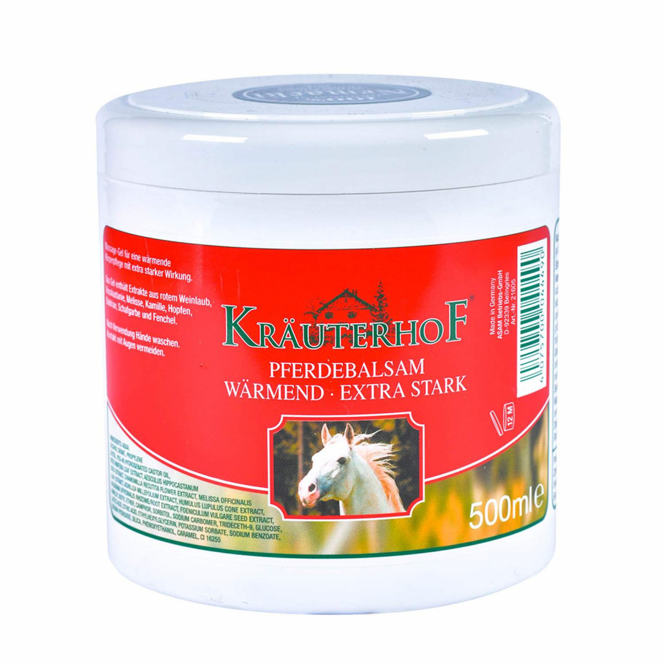 KRAUTERHOF ORIGINAL KONJSKI BALZAM SA EFEKTOM TOPLOTE 500 ML Prirodni melem sa efektom zagrevanja, nastao po originalnoj nemačkoj recepturi pre više od 100 godina Efekat zagrevanja kože utiče na smirivanje reumatskog bola i ne povećava krvni pritisak. Konjski balzam sa efektom zagrevanja sa ekstra snažnim dejstvom preporučuje se za: -lošu perifernu cirkulaciju, -masažu i -zagrevanje kože. Ne sadrži nikakve sastojke štetne po ljudsko zdravlje Način upotrebe:Nekoliko puta dnevno željeno mesto namazati balzamom u tankom sloju. Isprati ruke nakon nanošenja. Izbegavati kontakt sa očima, služokožom i otvorenim ranama. Sastav: Ekstrakte lišća vinove loze, kamilice, valerijane, hajdučke trave, hmelja, imele, mirođije i divljeg kestena. Pakovanje: 500ml Zemlja porekla: Nemačka