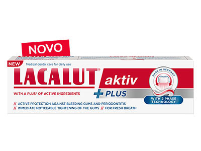 Lacalut aktiv plus medicinska pasta za zube sadrži dokazanu Lacalut aktiv formulu, sa većom koncentracijom aktivnih sastojaka i dvofaznom tehnologijom. Bela faza sadrži: Aluminium lactate za još uočljivije zatezanje desni Sodium fluoride koji štiti od karijesa Chlorohexidine – ima antibakterijski efekat Hydroxylapatite – remineralizuje i učvršćuje gleđ Crvena faza se odlikuje zinc gluconatom koji omogućava svež dah i deluje antibakterijski. Lacalut aktiv plus predstavlja aktivnu zaštitu od krvarenja desni i parodontitisa, odmah primetno zateže desni i daje svež dah.