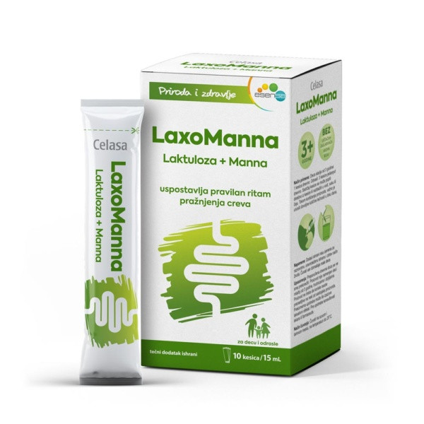 LaxoManna je tečni dodatak ishrani u monodoznom pakovanju za decu i odrasle, formulisan na bazi laktuloze i mane – koncentrovanog soka dobijenog iz kore crnog jasena. Aktivni sastojci LaxoManne stimulišu rad creva i ostvaruju blago laksativno delovanje, bez pojave intestinalne iritacije i drugih neželjenih efekata. ✔ Uspostavlja i održava pravilan ritam pražnjenja creva ✔ Za odrasle i decu stariju od 3 godine ✔ Bez veštačkih zaslađivača, boja i aroma ✔ Za direktnu primenu ili rastvaranje u vodi, soku ili čaju SASTAV: Aktivni sastojci 100 g sadrži: 1 kesica (15 ml(18 g)) sadrži: 3 kesice sadrže: Koncentrisani sok kore crnog jasena (Fraxinus ornus – Mana) (standardizovan na min. 85% manitola) 5,56 g 1 g * 3 g * Laktuloza 18,5 g 3,3 g * 10 g * Sastojci: prečišćena voda; laktuloza; zgušnjivač: glicerol; koncentrisani sok kore crnog jasena (Fraxinus ornus – Mana); zgušnjivač: ksantan guma; konzervans: kalijum sorbat; regulator kiselosti: limunska kiselina. Delovanje: Mana je osušen sok dobijen zasecanjem kore stabla i grana crnog jasena koji može da doprinosi normalnom varenju, ubrzanju prolaska crevnog sadržaja kroz creva i normalnoj funkciji creva. Laktuloza je disaharid koji se nakon oralne primene slabo resorbuje i do debelog creva dospeva u nepromenjenom obliku. Laktuloza doprinosi ubrzanju prolaska crevnog sadržaja kroz creva. Koristan efekat se postiže konzumiranjem pojedinačne porcije od 10 g laktuloze dnevno. LaxoManna se preporučuje za: Uspostavljanje i održavanje pravilnog ritma pražnjenja creva Održavanje normalne konzistencije i volumena stolice Ublažavanje konstipacije (zatvora) Način primene: Deca starija od 3 godine: 1 kesica dnevno. Odrasli: 3 kesice jedanput dnevno. Sadržaj kesice se može popiti direktno iz kesice ili razblažiti u vodi, soku ili čaju. Tokom korišćenja proizvoda, važno je unositi dovoljne količine tečnosti u toku dana. Napomene : Dodaci ishrani nisu zamena za raznovrsnu, uravnoteženu ishranu i zdrav način života. Čuvati van domaša male dece. Upozorenja: Preporučena dnevna doza se ne sme prekoračiti. Proizvod nije namenjen deci mlađoj od 3 godine, trudnicama i dojiljama. Proizvod ne treba da koriste osobe preosetljive na neki od sastojaka proizvoda. Prekomerna upotreba može da izazove laksativni efekat. Pre upotrebe konsultovati lekara ili farmaceuta.
