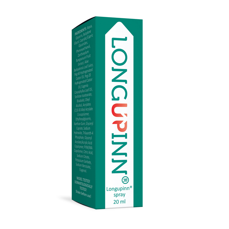 LONGUPINN SPREJ Jedinstveno prirodno rešenje za odlaganje refleksa ejakulacije Tečna emulzija lagane teksture na bazi aktivnih principa izolovanih iz ekstrakta ploda žutog drveta Zanthalene® (Zanthoxylum Bungeanum) i ulja karanfilića (Eugenia caryophyllus) koja muškim spoljašnjim genitalnim organima daje dugotrajan i prijatan osećaj zadovoljstva tokom seksualnog odnosa uz bolju kontrolu i odlaganje ejakulacije. Formulacija je obogaćena alojom i bisabololom koji pomažu u održavanju muških spoljašnjih genitalnih organa u dobrom stanju. Brz terapijski efekat, već od prve doze Produžava zadovoljstvo poboljšavajući kvalitet života oba partnera Lokalna primena omogućava izostanak sistemskih neželjenih efekata Jednostavna primena i visoka komplijansa Bezbedan za dugotrajnu upotrebu NAČIN PRIMENE PRE UPOTREBE PROMUĆKATI! Aplikovati jednu do dve doze u oblasti penisa i nežno umasirati, 10 minuta pre seksualnog odnosa Nije neophodno ispirati ga nakon seksualnog odnosa Nije kontraindikovan kod osoba mlađih od 18 godina Može se koristiti zajedno sa kondomom i drugim sredstvima kontracepcije Može se koristiti svakodnevno u dužem vremenskom periodu u kontinuitetu Pakovanje: sprej 20ml
