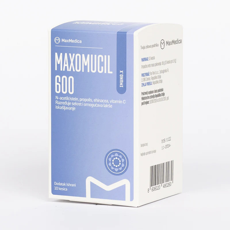 N-acetilcistein, propolis, ehinacea, vitamin C Razređuje sekret i omogućava njegovo lakše iskašljavanje Doprinosi bržem oporavku tokom i nakon bolesti MaxoMucil 600 je formulisan na bazi N-acetilcisteina (NAC), propolisa, ehinacee i vitamina C. N-acetilcistein je snažan mukolitik, koji razređuje gusti, viskozni sekret i omogućava njegovo lakše izbacivanje, čime se uspostavlja normalan protok vazduha kroz disajne puteve i olakšava disanje. N-acetilcistein ispoljava i antioksidativno delovanje, tako što štiti ćelije od štetnog delovanja slobodnih radikala koji narušavaju njihovu strukturu i funkciju. Propolis doprinosi normalnoj funkciji imunog sistema i zahvaljujući svom prirodnom antimikrobnom delovanju, štiti sluznicu disajnih puteva od razvoja bakterijskih, virusnih i gljivičnih infekcija. Propolis sadržan u MaxoMucilu je standardizovan na 10% flavonoida. Flavonoidi kao osnovni aktivni principi propolisa su odgovorni za njegovo imunostimulativno delovanje i jačanje odbrambene sposobnosti organizma. Zbog specifičnog sastava, na propolis se ne može razviti rezistencija. Ehinacea deluje imunostimulativno, antiinflamatorno i antiseptično. Ona povećava odbrambenu sposobnost organizma tako što aktivira ćelije imunog sistema odgovorne za prepoznavanje i eliminaciju patogena (bakterija, virusa) i doprinosi jačanju nespecifičnog imuniteta. Vitamin C doprinosi zaštiti ćelija od oksidativnog stresa, normalnom energetskom metabolizmu i smanjenju umora i iscrpljenosti. Produktivni kašalj Pojačano stvaranje sekreta u disajnim putevima i otežano disanje Bakterijske i virusne respiratorne infekcije praćene kašljem Pakovanje: 20 kesica Način upotrebe: Jednom dnevno sadržaj 1 kesice rastvoriti u pola čaše vode, promešati kašičicom i odmah popiti. Preporučuje se unos većih količina vode tokom dana. Sastav proizvoda: Aktivni sastojci 1 kesica NRV*/PDU** N-acetilcistein 600 mg / Vitamin C (u obliku L-askorbinske kiseline) 120 mg 150% Suvi ekstrakt korena ehinacee (Echinacea purpurea), 6:1 80 mg / Suvi ekstrakt propolisa standardizovan na minimum 10% flavonoida 30 mg / NRV* – nutritivna referentna vrednost Prijatan ukus pomorandže.