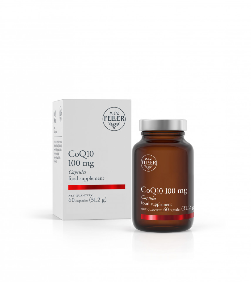 MEV FELLER CoQ10 100 mg Koenzim Q10 (CoQ10) je preko potreban molekul rasprostranjen u raznim tkivima i organima našeg tela, a najviše je koncentrisan u srčanom mišiću. Sa godinama se te koncentracije smanjuju, a uzrok su i stanja oksidativnog stresa koji deluje na promenu strukture i funkcije ćelija. Dodatak ishrani koji u jednoj kapsuli sadrži 100 mg CoQ10. Aktivni sastojci: u dnevnoj dozi (1 kapsula): koenzim Q10 (ubihinon) 100 mg Pakovanje: 60 kapsula