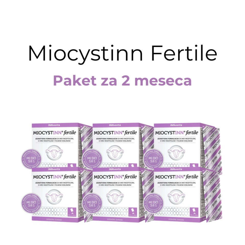 MiocystiNN Fertile – Set od 6 x 20 kesica za 2 meseca korišćenja Miocystinn fertile je dijetetski suplement koji sadrži mio-inozitol, D-hiro-inozitol i folnu kiselinu koji se preporučuje kao dodatak terapiji ženama koje imaju poremećaje prouzrokovane sindromom policističnih jajnika i metaboličkim sindromom. Miocystinn fertile može pomoći kod: Uspostavljanja hormonske ravnoteže Regulisanja menstrualnog ciklusa Poboljšavanja sazrevanje folikula i kvaliteta oocita Povećavanja plodnost Smanjivanja hiperandogenizma Smanjivanja insulinske rezistencije Bez neželjenih efekata Šta sadrži MIOCYST INN ® Fertile? Aktivni sastojci 1 kesica 2 kesice (dnevna doza) %NRV* CARONOSITOL Fertility 3,6:1 od toga: 0,7 g 1,4 g Mio-inozitol 0,55 g 1,1 g D-hiro-inozitol 0,15 g 0,3 g Folna kiselina, 1% na D-manitolu, od toga: 24 mg 48 mg Folna kiselina 200 µg 400 µg 200 Zahvaljujući dejstvu mio-inozitola smanjuje se nivo testosterona, a povećava se broj ovulacija i plodnost. Pored toga, on razlaže masti i snižava nivo holesterola u krvi, ali i povećava osetljivost receptora na serotonin, pa ima pozitivan uticaj na raspoloženje. Folna kiselina , spada u vitamine grupe B i smatra se da reguliše infertilitet kao jednu od posledica postojanja PCOS-a. Pored toga, folna kiselina smanjuje nivo homocisteina koji je povezan sa različitim bolestima kardio-vaskularnog sistema i hiperinsulinemijom. Redovan unos je preporučen svim ženama koje žele da zatrudne, trudnicama i onima koje boluju od PCOS i metaboličkog sindroma. Način primene Rastvoriti sadržaj jedne kesice u čaši vode i popiti, dva puta dnevno. Jedno pakovanje sadrži: 20 kesica