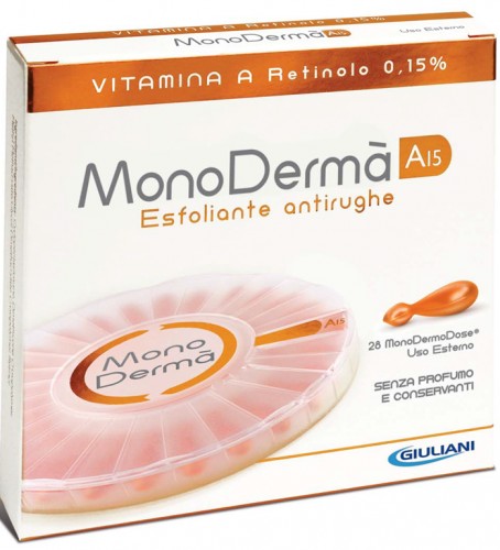 Monoderma A15 sadrži čist vitamin A-retinol u koncentraciji od 0.15%. Vitamin A je od velike važnosti za kožu, jer je odgovoran za stalno obnavljanje epitela, mehanizmom ćelijske obnove. Retinol je pokazao efikasnost u odlaganju starenja: dodatno inicira proces regeneracije ćelija stimulacijom produkcije kolagena i elastina, vrši blagu eksfolijaciju i proces omekšavanja čime se smanjuje dubina bora. Monoderma A15 je indikovana za anti-aging zrele kože, daje licu mekoću, odmoran izgled, značajno smanjujući diskoloritet. Monoderma A15 je takođe indikovana za tretman kože sklone aknama, tako što Retinol reguliše produkciju sebuma, minimizuje proširene pore i učestvuje u normalizaciji kože što je značajno za prevenciju stvaranja mitisera. Način primene: Sadržaj jedne meke kapsule Monoderma A15 naneti jednom dnevno na odabrane delove kože. Pakovanje: 28 mekih kapsula