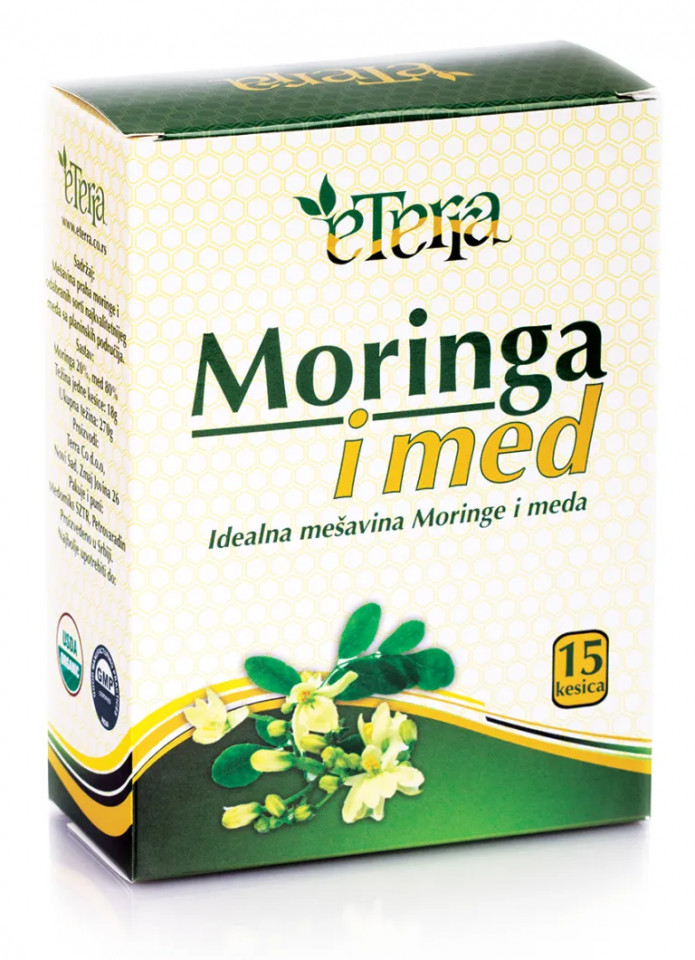 MORINGA I MED 15 KESICA Idealna mešavina moringe i meda. Sastojak moringe, zeatin vrhunski je antioksidant i snažno detoksikuje organizam. Ima višestruku ulogu kao dodatak terapiji ubrzava formiranje hemoglobina i mioglobina, a pomaže i kod regulacije krvnog pritiska, gubitka energije i težine, neuhranjenosti, lupusa, čišćenja debelog creva i crevnih poremećaja, raznih upalnih i drugih promena na koži – čireva, ulcera, reumatoidnog artritisa, osteoporoze, impotencije, menstrualnih tegoba, groznice, glavobolje. Kao vitaminski dodatak ishrani s adrži potrebne hranljive materije koje pružaju osećaj lakoće i energije a takodje smanjuju osećaj “napada” gladi. Može poslužiti kao zamena za obrok. Način upotrebe: Kesicu rastvoriti u mlakoj vodi ili limunadi. Pakovanje: 15 kesica Zemlja porekla: Srbija