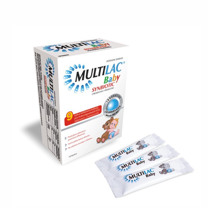 Multilac Baby je sinbiotik poslednje generacije koji sadrži fruktooligosaharide FOS i 9 slojeva živih bakterija uključujući Lactobacilius rhamnosus GG. Multilac Baby je proizveden korišćenjem inovativne tehnologije mikroinkapsuliranja- Micro Mure koja štiti bakterije pomoću dva sloja: proteinskog i polisaharido-hidrokoloidnog. Dvostruki zaštitni sloj štiti bakterije od destruktivne aktivnosti želudačnog soka i digestivnih enzima. Micro mure tehnologija produžava aktivnost i povećava efikasnot bakterija koje se nalaze u ovom proizvodu. Fruktooligosaharidi FOS stimulišu rast bakterija, olakšavaju naseljavanje creva i na taj način produžavaju njihovu aktivnost. Multilac Baby ne sadrži mleko ni kazein, te je zbog toga bezbedan za osobe alergične na ove proizvode. Multilac Baby se kao dodatak ishrani preporučuje kod dece starosti 4 meseca i starije: Za održavanje normalne crevne flore kako bi se olakšalo funkcionisanje creva Za vreme i nakon terapije antibioticima U slučaju poremećaja normalnog funkcionisanja creva U periodu povećanja osetljivosti na infekcije Šta treba da znate pre nego što uzmete Multilac Baby? Multilac Baby ne treba koristiti ako ste alergični (preosetljivi) na bilo koji sastojak proizvoda. Kako se upotrebljava Multilac Baby? Deca starosti 4 meseca i starija: 1 kesica dnevno. Bebama starijim od 4 meseca sadržaj kesice treba rastvoriti u vodi ili mleku (majčinom ili formuli za odojčad). Deca starosti 2 godine i starija kao i odrasli: pomešati sa vodom, mlekom, jogurtom ili uzeti direktno iz kesice. Preporučenu dnevnu dozu ne treba prekoračivati. Kako čuvati Multilac Baby? Multilac Baby čuvati na temperaturi do 25C, na suvom mestu. Čuvati van domašaja dece i vidokruga male dece. Zaštićeno od svetlosti. Multilac Baby ne zahteva čuvanje u frižideru. Važne informacije: Dodaci ishrani se ne mogu koristiti kao zamena za raznovrsnu ishranu. Proizvod je namenjen bebama starijim od 4 meseca i deci. Vožnja i upravljanje mašinama: Multilac Baby nema uticaja na vožnju ili upravljanje mašinama. Pakovanje: 10 kesica