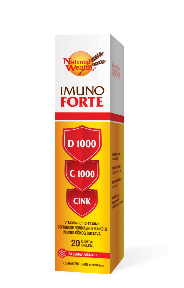 Imuno Forte D 1000 C 1000 cink dijetetski proizvod – hrana za posebne medicinske namene 3 u 1 proizvod: vitamin D, vitamin C i cink savetuje se za zdrav imunitet šumeće tablete ukusa pomorandže i grejpa preporučuje se kao dopuna vitamina D, C i cinka, posebno u zimskom periodu Vitamini C, D i cink doprinose normalnoj funkciji imunog sistema. Način uzimanja: Jedna (1) šumeća tableta dnevno, rastvorena u čaši vode (2,5 dl vode). Sveže pripremljen napitak odmah popiti. Pakovanje: 20 šumećih tableta
