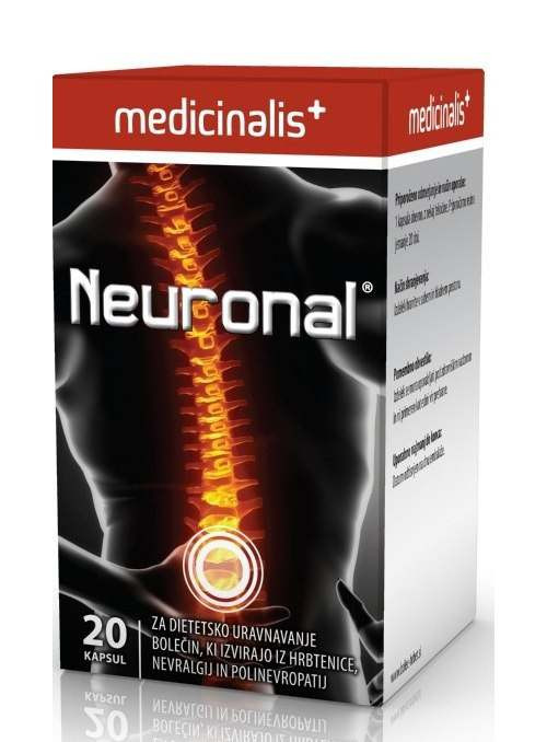 Neuronal® sadrži NCFR-6, jedinstvenu kombinaciju nukleotida i vitamina koja utiče na prirodni proces regeneracije oštećenih nerava prilikom bolnih stanja povezanih sa kičmenim stubom. Kombinacija aktivnih supstanci u proizvodu Neuronal® je pažljivo odabrana na bazi pozitivnih rezultata naučnih istraživanja. Aktivni sastojci koji se nalaze u dodatku ishrane Neuronal® imaju uticaja na prirodni proces regeneracije oštećenih nerava prilikom bolnih stanja povezanih sa kičmenim stubom kao što su: bol u vratu bolni sindrom u lumbalnoj regiji bolni sindrom u regiji ramena i ruku lumbago ili bolni sindrom u donjim partijama leđa išijas kompresija korena spinalnih nerava različite radikulopatije diskus hernije (pre ili postoperativno) sa posledičnim neuralgijama i polineuropatijama NEURONAL® sadrži NCFR-6, jedinstvenu kombinaciju nukleotida i vitamina: Nukleotid (UMP) – 50 mg Niacin – 20 mg Vitamin B6 – 4,2 mg Vitamin B1 – 3 mg Folati – 400 µg Vitamin B12 – 9 µg Ne sadrži so, gluten, kvasac, soju ili mlečne proizvode. Proizvod je bez konzervanasa. Pogodan je za vegane i vegeterijance. Doziranje: jedna kapsula dnevno uz malo vode preporučuje se da se kapsule uzimaju najmanje jedan mesec Korisnici će osetiti benefite korišćenja Neuronal® kapsula već nakon nekoliko dana. Ako je neophodno, uzimanje Neuronal® kapsula se može ponoviti sve dok pacijenti ne osete poboljšanje. Neuronal® je prirodni i bezbedan proizvod pa se može uzimati onoliko dugo koliko je to neophodno. Pakovanje: 20 kapsula