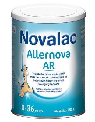 Alergijska formula Novalac Allernova AR je namenjena novorođančadi i odojčadi koja imaju alergiju na proteine kravljeg mleka (od rođenja do 3. godine). Sadrži ekstenzivni hidrolizat kazeina, koji je zlatni standard kod alergija na proteine kravljeg mleka i kukuruzni skrob, pa rešava i problem bljuckanja. Jedina je formula na tržištu koja ima dvostruko delovanje. Ublažava tegobe povezane sa alergijom na belančevine kravljeg mleka (proliv, zatvor, preteran plač, grčevi, svrab na koži…). Pakovanje sadrži 400 g.