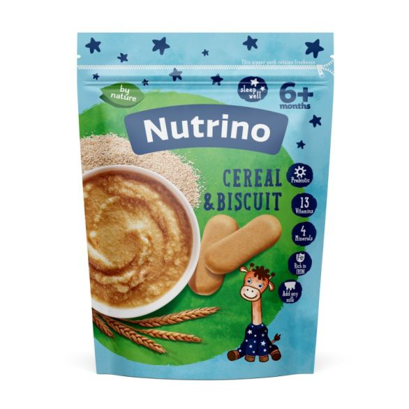 Nutrino mlečna instant kaša sa keksom 200g je kaša koja se proizvodi od prirodnih sastojaka i dodatno je obogaćena sa 13 vitamina i 4 minerala – Ca, Fe, Zn, J koji ne podležu termičkoj obradi. To im omogućava da sačuvaju sva svoja hranjiva svojstva. Nutrino kaša je bogata gvožđem koje doprinosi normalnom kognitivnom razvoju dece. Izvor vlakana. Sastav: Pšenično brašno 47%, keks 41% (pšenično brašno, šećer, biljna mast (palmina), invertni sirup, obrano mleko u prahu, sredstva za dizanje testa: amonijum-hidrogenkarbonat i natrijum-hidrogenkarbonat, emulgator: sojin lecitin, kuhinjska so), šećer u prahu, inulin 0,8%, vitamini (tiamin-mononitrat, riboflavin, piridoksin-hidrohlorid, L-askorbinska kiselina, DL-a-tokoferilacetat, retinilacetat, holekalciferol, nikotinamid, pteroilmonoglutaminska kiselina, D-biotin, kalcijum-D-pantotenat, cijanokobalamin, filohinon), minerali (kalcijum-karbonat, gvožđe (11)-fumarat, cink-oksid, kalijum-jodid) i ekstrakt vanile. Zemlja porekla: Srbija