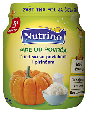 Nutrino kašica bundeva, pavlaka i pirinač 125g. Dijetetski proizvod. Hrana za odojčad i malu decu. Sastav: Bundeva 81%, pavlaka 9% (pasterizovana, homogenizovana pavlaka sa 20% m.m.), pirinčano brašno 5%, punomasno mleko u prahu. Sterilizovano. Zaštitna folija čuva proizvod od svetlosti, prašine i otvaranja. Zemlja porekla: Srbija