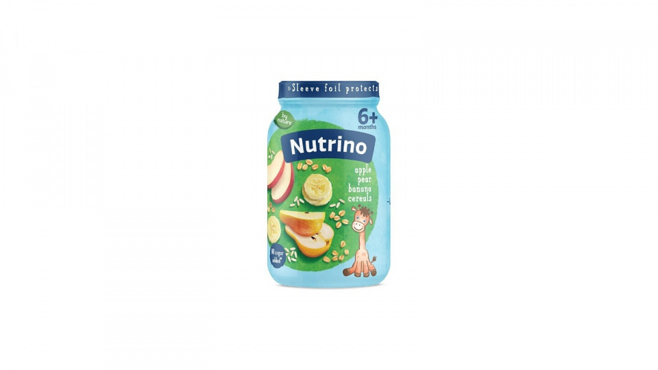 Nutrino kašica jabuka, kruška, banana, žitarice 190g. Dijetetski proizvod. Hrana za odojčad i malu decu. 100% prirodno, bez dodatog šećera. Sastav: Voće 96% (jabuka 75%, kruška 12%, banana 9%) , žitarice 4% Sterilizovano. Zaštitna folija čuva proizvod od svetlosti, prašine i otvaranja.