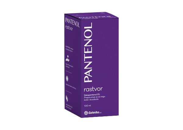 Dekspantenol, aktivan princip PANTENOL rastvora, pretvara se u organizmu u pantotensku kiselinu. Aktivni oblik pantotenske kiseline u tkivima je koenzim A. Koenzim A je neophodan za metabolizam ugljenih hidrata, masti i belančevina i detoksikaciju nekih produkata metabolizma. Na nivou zdrave kože i kose ovi procesi pomažu u očuvanju pravilne funkcije kože i kose. PANTENOL rastvor se preporučuje: – za negu iritirane kože i sluzokože – za negu kože nakon sunčanja – za negu krte i tanke kose, nedovoljno pigmentisane kose i kose bez sjaja. – za negu tretirane kose bojenjem, mini valom, sušenjem i feniranjem – kod „cvetanja“ dugačke ili kozmetički tretirane kose. Sastojci: Aqua, Panthenol, Sodium Benzoate, Sodium Citrate, Citric Acid. Način primene PANTENOL rastvor primenjuje se, nerazblažen ili razblažen vodom u odnosu 1:1, za ispiranje i oblaganje promena na koži. PANTENOL rastvor primenjuje se, razblažen vodom u odnosu 1:5, za ispiranje promena na sluzokoži. Za negu kose, PANTENOL rastvor se, nerazblažen ili razblažen vodom u odnosu 1:1, 2 puta dnevno utrljava u vlasište
