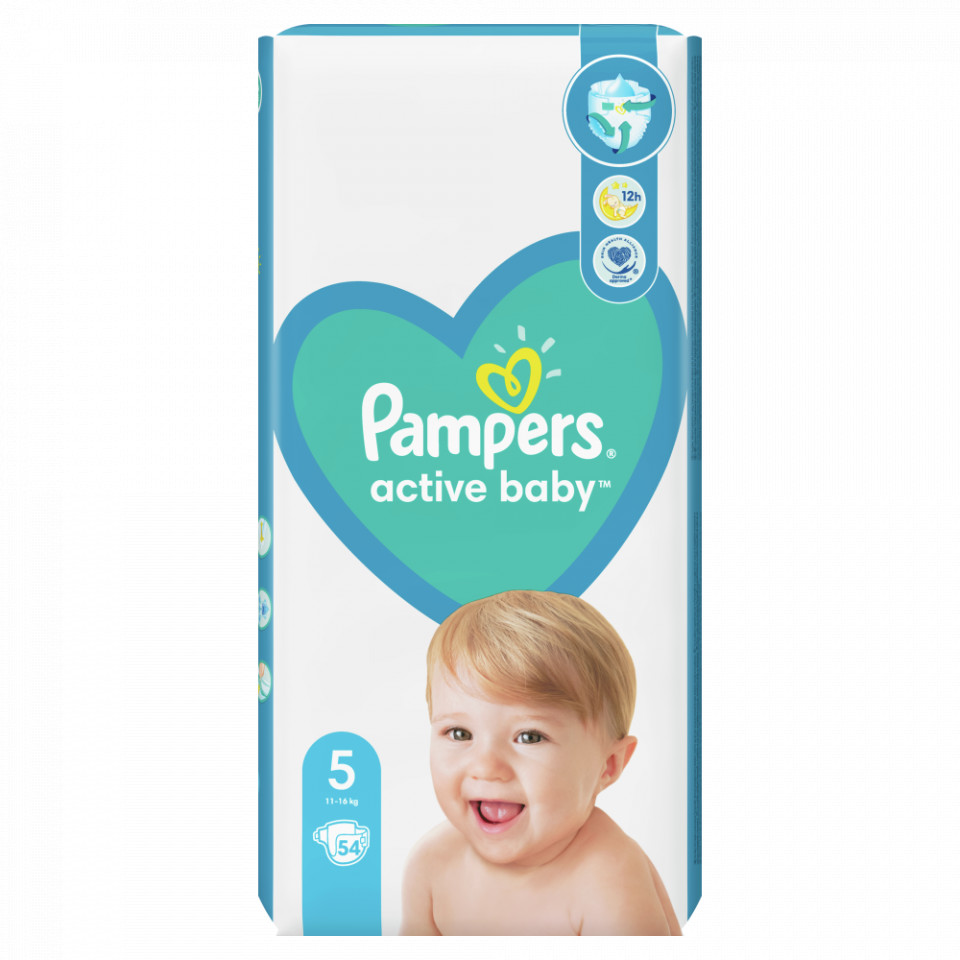 Da li ste znali da se vaša beba, dok spava, kreće i do dva puta više nego odrasla osoba? Nakon noći pune kretanja, pelena može postati vlažna i teška, što sprečava bebu da dobro spava. Uz Pampers Active Baby, bez obzira koliko se kreće i u kom položaju spava, koža vaše bebe ostaje zaštićena od vlažnosti i do 12 sati. Pampers Active Dry pelena brzo upija tečnost održavajući bebinu kožu suvom preko noći, zahvaljujući dodatnom gornjem sloju koji ravnomerno raspoređuje tecnost. Zadržava vlažnost dalje od bebine kože – Unutrašnji sloj sa Micro-Pearls tehnologijom upija i drži vlažnost u peleni, daleko od nežne kože vaše bebe, istovremeno nudeći do 12 sati zaštite od vlažnosti. Pampers Active Baby pelene imaju dvostruku zaštitnu barijeru protiv curenja. Kanali u peleni Pampers Active Baby omogućavaju protok vazduha kroz pelenu, pa koža može da dise i oseća se suvo. Pelene Pampers Active Baby izrađene su od materijala mekog poput pamuka*, tako da se vaša beba tokom dana oseća ugodno. Elastične trake omogućavaju udobno prianjanje i zaštitu od curenja . *ne sadrže pamuk