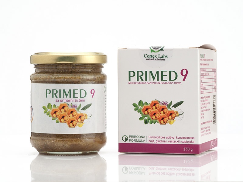 Primed 9 Brusnica Preparat Primed 9 je prirodan preparat na bazi meda, brusnice, kantariona i hajdučke trave. Ne sadrži veštačke boje, konzervanse i druge aditive. Primed 9 brusnice se primenjuje kod: urinarnih infekcija, posebno E.coli infekcije gastritisa, posebno H.pylori infekcije Aktivni sastojci preparata mogu povoljno da deluju u prevenciji i tretmanu čestih urinarnih infekcija. Blagotvorno deluju na želudac i simptome koji prate gastritis. Način upotrebe: Odrasli i deca starija od 10 godina: Uzimati 1-2x dnevno po 1 kafenu kašičicu preparata, pola sata pre ili 2h nakon obroka. Polako otopiti u ustima, a zatim progutati. Preparat je najbolje upotrebljavati ujutru, na prazan želudac. Deca od 3 do 10 godina: Uzimati 1-2x dnevno po pola kašičice preparata, pola sata pre ili 2h nakon obroka. Pakovanje: 250g Zemlja porekla: Srbija Sastav: Med (Mel) , brusnica (Vitis ideae fructus), kantarion (Hypericum perforatum), hajdučka trava (Achillea millefolium).