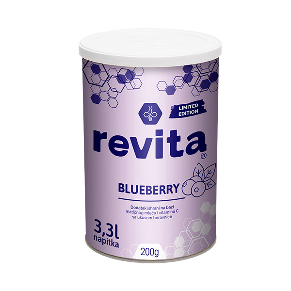 REVITA BLUEBERRY 200G Osvežavajući ukus borovnice uz još više vitamina C. Pogodan za: jačanje imuniteta, povećane otpornosti na stres, za decu, za sportiste, za osobe izložene povećanim umnim i fizičkim naporima, kao i zagađenjima u radnom i životnom okruženju. Upotreba: Deca od 3-12 godina: Dve kafene kašike granula (12 g) rastvoriti u čaši vode (0,2 L) i popiti jednom dnevno. Deca od 12-18 godina: Dve kafene kašike granula (12 g) rastvoriti u čaši vode (0,2 L) i popiti 2 puta dnevno. Odrasli: Dve kafene kašike granula (12 g) rastvoriti u čaši vode (0,2 L) i popiti 3-5 puta dnevno. Pakovanje: 200g Zemlja porekla: Srbija