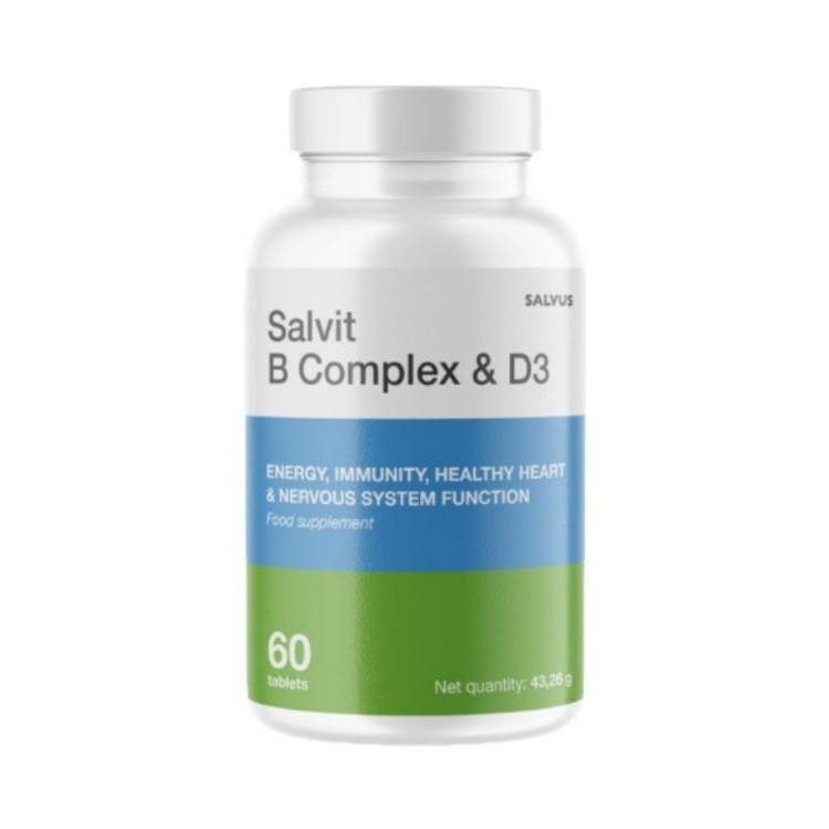 Salvit B Complex i D3 tablete sadrže kombinaciju 9 vitamina – vitamine tiamin, B2, niacin, pantotenska kiselina, B6, B7 (biotin), B9 (folna kiselina), vitamin B12 i PABA kao i vitamin D3. Način upotrebe Jedna tableta dnevno. Sastav U jednoj tableti: PABA 30 mg; tiamin 20 mg (1818,18 %); niacin 25 mg (156,25 %); vitamin B2 20 mg (1428,57 %); pantotenska kiselina 15 mg (250 %); vitamin B6 15 mg (1071,43 %); vitamin B12 15 μg (600 %); vitamin D3 10 μg (200 %) (400 I.J.); folna kiselina 400 μg (200 %); biotin 150 μg (300 %)