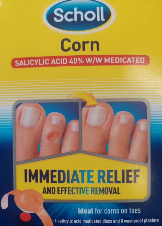 SCHOLL FLASTERI ZA KURJE OKO 8 KOMADA Scholl flaster za kurje oko uklanja kurje oko, žuljeve, zadebljanja na koži. Deo flastera sa salicilnom kiselinom precizno deluje na deo koji treba ukloniti, a ostatak flastera štiti zdravu kožu. Posebno su pogodni za uklanjanje žuljeva na nožnim prstima. Meki jastučići trenutno olakšavaju tegobu usled izraslina, dok Scholl Disc System štiti zdravu kožu koja okružuje izrasline. Način upotrebe: Lepi se na čista i suva stopala, tako što se skine disk sa zaštitnog papira i čvrsto pritisne iznad centra žulja, zatim se pokrije jastučetom i fiksira trakama. Postupak se svakodnevno ponavlja dok se žulj ne ukloni. Pakovanje: 8 komada Zemlja porekla: Nemačka
