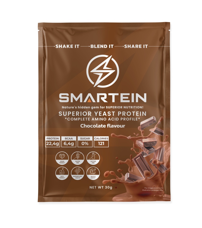 Praškasta smeša za pripremu proteinskog napitka za izgradnju i obnovu mišića. SMARTEIN ® je protein najnovije generacije nastao ekstrakcijom kvasca Saccharomyces cerevisiae . Nastaje postupkom kvasne fermentacije melase, šećerne trske i cvekle. Mikrobnog porekla, protein iz kvasca se dobija potpuno prirodnim postupkom koji je pouzdan, ekološki prihvatljiv i dugoročno održiv. SMARTEIN ® sadrži visoki procenat proteina, uključujući sve esencijalne i neesencijalne aminokiseline koje učestvuju u izgradnji tkiva organizma. Visok sadržaj BCAA (aminokiselina razgranatog lanca – leucin, izoleucin i valin) učestvuje u sintezi mišićnih vlakana. SMARTEIN ® je posebno pogodan za osobe izložene većem psiho-fizičkom naporu, fitnes populaciji, osobama alergičnim ili intolarentnim na laktozu i gluten, za vegane, za osobe koje žele da povećaju dnevni unos proteina, za stariju populaciju kao i za rekonvalescente. SMARTEIN ® ne sadrži alergene niti veštačke boje. Prirodno je obogaćen beta-glukanima i vitaminima B grupe. Vitamin D doprinosi normalnoj funkciji imunog sistema. Vitamin B12 doprinosi smanjenju umora i iscrpljenosti i održavanju normalnog energetskog metabolizma.